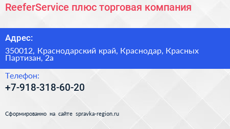 ReeferService плюс, торговая компания по адресу 350012, Краснодарский край, Краснодар, Красных Партизан, 2а в дальнейшем Организация, размещена в следующих категориях: