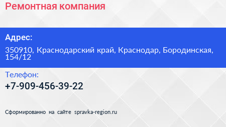 Ремонтная компания по адресу 350910, Краснодарский край, Краснодар, Бородинская, 154/12 в дальнейшем Организация, размещена в следующих категориях: