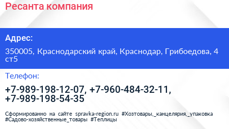 Ресанта, компания по адресу 350005, Краснодарский край, Краснодар, Грибоедова, 4 ст5 в дальнейшем Организация, размещена в следующих категориях: