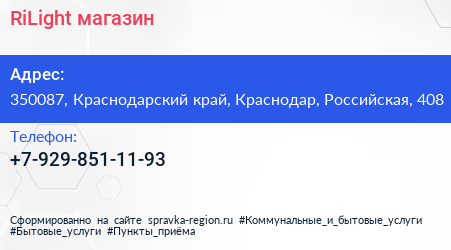 RiLight, магазин по адресу 350087, Краснодарский край, Краснодар, Российская, 408 в дальнейшем Организация, размещена в следующих категориях: