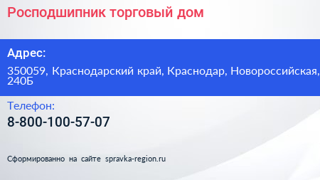 Росподшипник, торговый дом по адресу 350059, Краснодарский край, Краснодар, Новороссийская, 240Б в дальнейшем Организация, размещена в следующих категориях: