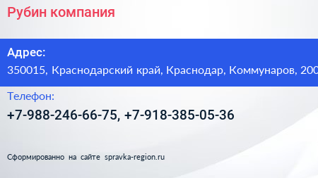 Рубин, компания по адресу 350015, Краснодарский край, Краснодар, Коммунаров, 200 в дальнейшем Организация, размещена в следующих категориях: