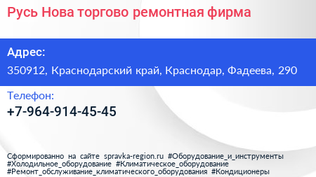 Русь-Нова, торгово-ремонтная фирма по адресу 350912, Краснодарский край, Краснодар, Фадеева, 290 в дальнейшем Организация, размещена в следующих категориях: