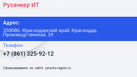 Русанкер ИТ по адресу 350080, Краснодарский край, Краснодар, Производственная, 19 в дальнейшем Организация, размещена в следующих категориях:
