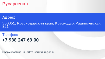 Русарсенал по адресу 350051, Краснодарский край, Краснодар, Рашпилевская, 321 в дальнейшем Организация, размещена в следующих категориях: