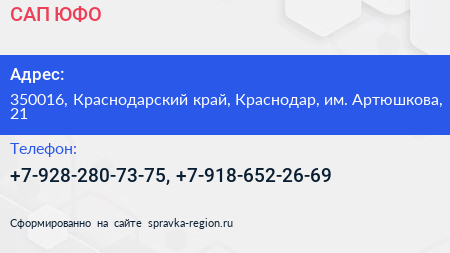 САП-ЮФО по адресу 350016, Краснодарский край, Краснодар, им. Артюшкова, 21 в дальнейшем Организация, размещена в следующих категориях: