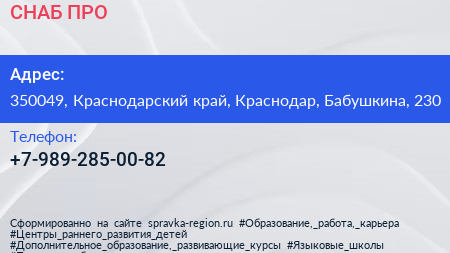 СНАБ ПРО по адресу 350049, Краснодарский край, Краснодар, Бабушкина, 230 в дальнейшем Организация, размещена в следующих категориях: