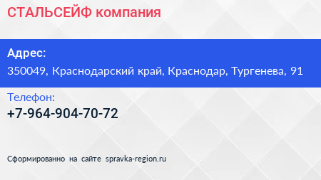 СТАЛЬСЕЙФ, компания по адресу 350049, Краснодарский край, Краснодар, Тургенева, 91 в дальнейшем Организация, размещена в следующих категориях: