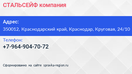 СТАЛЬСЕЙФ, компания по адресу 350012, Краснодарский край, Краснодар, Круговая, 24/10 в дальнейшем Организация, размещена в следующих категориях: