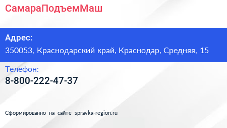 СамараПодъемМаш по адресу 350053, Краснодарский край, Краснодар, Средняя, 15 в дальнейшем Организация, размещена в следующих категориях: