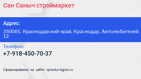 Сан Саныч, строймаркет по адресу 350065, Краснодарский край, Краснодар, Автолюбителей, 12 в дальнейшем Организация, размещена в следующих категориях:
