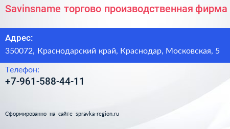 Savinsname, торгово-производственная фирма по адресу 350072, Краснодарский край, Краснодар, Московская, 5 в дальнейшем Организация, размещена в следующих категориях:
