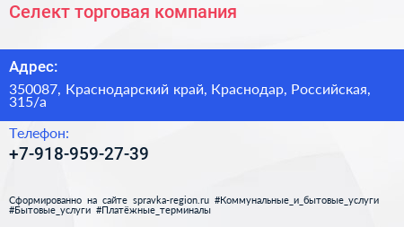 Селект, торговая компания по адресу 350087, Краснодарский край, Краснодар, Российская, 315/а в дальнейшем Организация, размещена в следующих категориях: