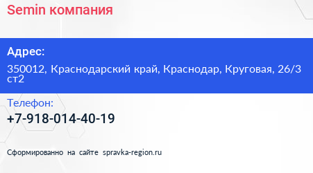 Semin, компания по адресу 350012, Краснодарский край, Краснодар, Круговая, 26/3 ст2 в дальнейшем Организация, размещена в следующих категориях: