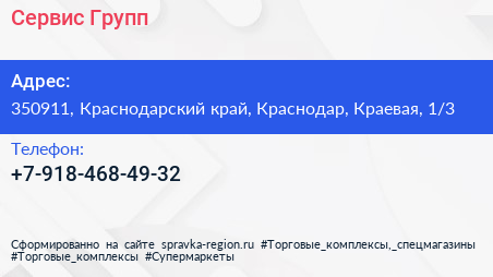 Сервис Групп по адресу 350911, Краснодарский край, Краснодар, Краевая, 1/3 в дальнейшем Организация, размещена в следующих категориях: