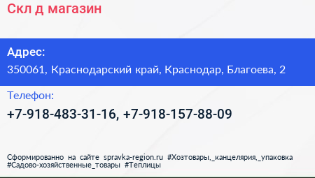 Скл@д, магазин по адресу 350061, Краснодарский край, Краснодар, Благоева, 2 в дальнейшем Организация, размещена в следующих категориях: