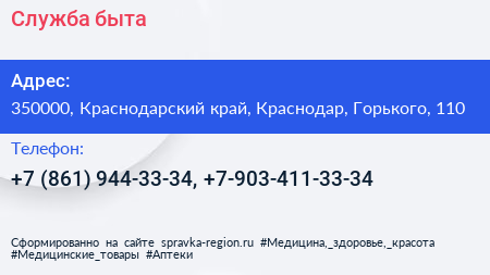 Для связи с организацией воспользуйтесь номером телефона: +7 (861) 944-33-34, +7-903-411-33-34. Пн: c 09:00-19:00, Вт: c 09:00-19:00, Ср: c 09:00-19:00, Чт: c 09:00-19:00, Пт: c 09:00-19:00, Сб: c 09:00-17:00, Вс: выходной, вы можете обратиться в эту организацию.
