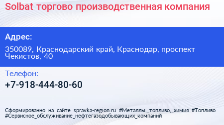Solbat, торгово-производственная компания по адресу 350089, Краснодарский край, Краснодар, проспект Чекистов, 40 в дальнейшем Организация, размещена в следующих категориях: