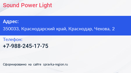 Sound Power Light по адресу 350033, Краснодарский край, Краснодар, Чехова, 2 в дальнейшем Организация, размещена в следующих категориях: