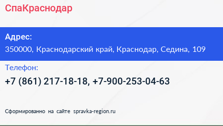 СпаКраснодар по адресу 350000, Краснодарский край, Краснодар, Седина, 109 в дальнейшем Организация, размещена в следующих категориях: