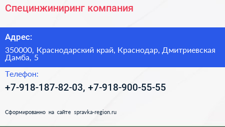 Специнжиниринг, компания по адресу 350000, Краснодарский край, Краснодар, Дмитриевская Дамба, 5 в дальнейшем Организация, размещена в следующих категориях: