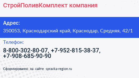 СтройПоливКомплект, компания по адресу 350053, Краснодарский край, Краснодар, Средняя, 42/1 в дальнейшем Организация, размещена в следующих категориях: