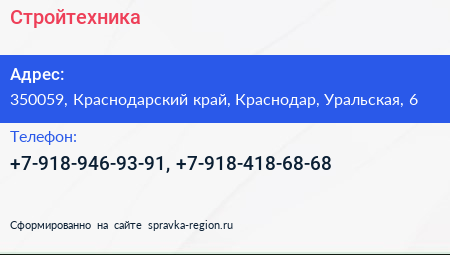 Стройтехника по адресу 350059, Краснодарский край, Краснодар, Уральская, 6 в дальнейшем Организация, размещена в следующих категориях: