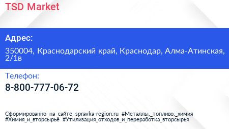 TSD-Market по адресу 350004, Краснодарский край, Краснодар, Алма-Атинская, 2/1в в дальнейшем Организация, размещена в следующих категориях: