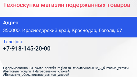 Техноскупка, магазин подержанных товаров по адресу 350000, Краснодарский край, Краснодар, Гоголя, 67 в дальнейшем Организация, размещена в следующих категориях: