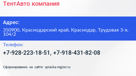 ТентАвто, компания по адресу 350900, Краснодарский край, Краснодар, Трудовая 3-я, 104/2 в дальнейшем Организация, размещена в следующих категориях: