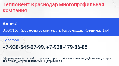 ТеплоВент-Краснодар, многопрофильная компания по адресу 350015, Краснодарский край, Краснодар, Седина, 164 в дальнейшем Организация, размещена в следующих категориях: