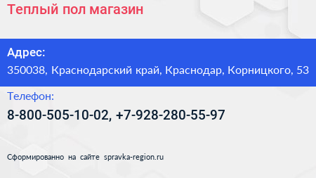 Теплый пол, магазин по адресу 350038, Краснодарский край, Краснодар, Корницкого, 53 в дальнейшем Организация, размещена в следующих категориях: