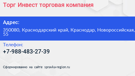 Торг-Инвест, торговая компания по адресу 350080, Краснодарский край, Краснодар, Новороссийская, 55 в дальнейшем Организация, размещена в следующих категориях: