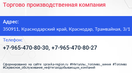 Торгово-производственная компания по адресу 350911, Краснодарский край, Краснодар, Трамвайная, 3/1 в дальнейшем Организация, размещена в следующих категориях: