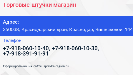 Торговые штучки, магазин по адресу 350038, Краснодарский край, Краснодар, Вишняковой, 144 в дальнейшем Организация, размещена в следующих категориях: