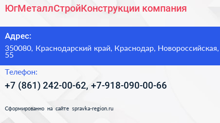ЮгМеталлСтройКонструкции, компания по адресу 350080, Краснодарский край, Краснодар, Новороссийская, 55 в дальнейшем Организация, размещена в следующих категориях: