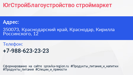 ЮгСтройБлагоустройство, строймаркет по адресу 350073, Краснодарский край, Краснодар, Кирилла Россинского, 12 в дальнейшем Организация, размещена в следующих категориях: