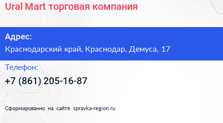 Ural Mart, торговая компания по адресу Краснодарский край, Краснодар, Демуса, 17 в дальнейшем Организация, размещена в следующих категориях: