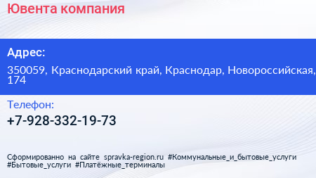 Ювента, компания по адресу 350059, Краснодарский край, Краснодар, Новороссийская, 174 в дальнейшем Организация, размещена в следующих категориях: