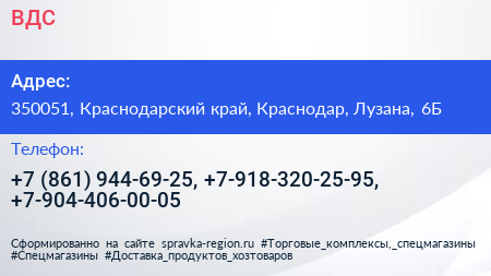 ВДС по адресу 350051, Краснодарский край, Краснодар, Лузана, 6Б в дальнейшем Организация, размещена в следующих категориях: