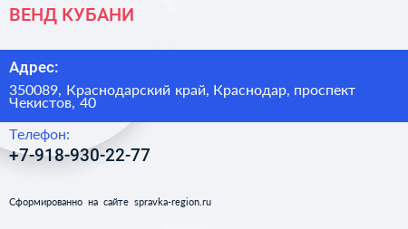 ВЕНД КУБАНИ по адресу 350089, Краснодарский край, Краснодар, проспект Чекистов, 40 в дальнейшем Организация, размещена в следующих категориях: