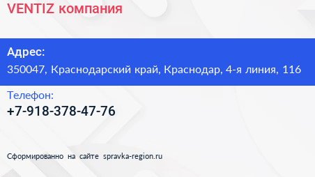 VENTIZ, компания по адресу 350047, Краснодарский край, Краснодар, 4-я линия, 116 в дальнейшем Организация, размещена в следующих категориях: