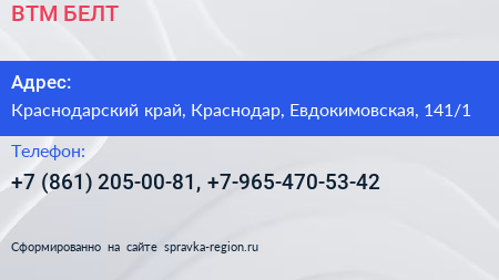 ВТМ-БЕЛТ по адресу Краснодарский край, Краснодар, Евдокимовская, 141/1 в дальнейшем Организация, размещена в следующих категориях: