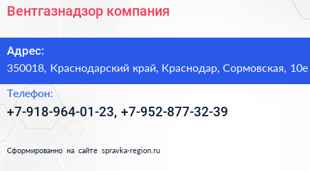 Вентгазнадзор, компания по адресу 350018, Краснодарский край, Краснодар, Сормовская, 10е в дальнейшем Организация, размещена в следующих категориях:
