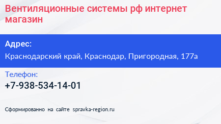 Вентиляционные-системы.рф, интернет-магазин по адресу Краснодарский край, Краснодар, Пригородная, 177а в дальнейшем Организация, размещена в следующих категориях: