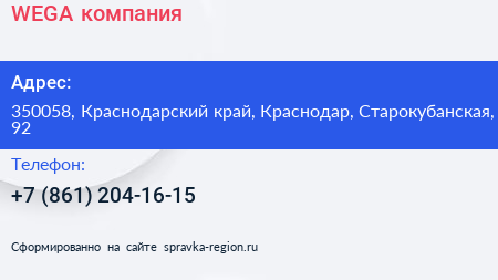 WEGA, компания по адресу 350058, Краснодарский край, Краснодар, Старокубанская, 92 в дальнейшем Организация, размещена в следующих категориях: