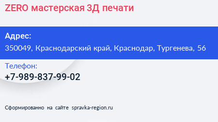 ZERO, мастерская 3Д печати по адресу 350049, Краснодарский край, Краснодар, Тургенева, 56 в дальнейшем Организация, размещена в следующих категориях: