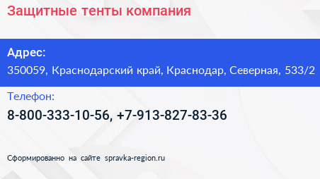 Защитные тенты, компания по адресу 350059, Краснодарский край, Краснодар, Северная, 533/2 в дальнейшем Организация, размещена в следующих категориях: