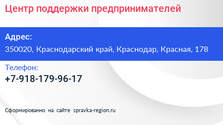 Центр поддержки предпринимателей по адресу 350020, Краснодарский край, Краснодар, Красная, 178 в дальнейшем Организация, размещена в следующих категориях: