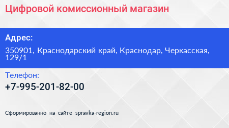 Цифровой, комиссионный магазин по адресу 350901, Краснодарский край, Краснодар, Черкасская, 129/1 в дальнейшем Организация, размещена в следующих категориях: